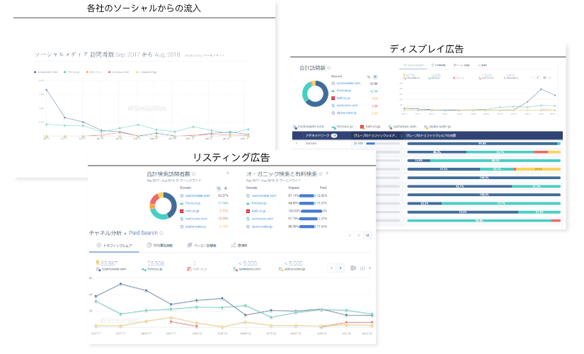 リサーチツールに、毎月5万円以上支払っているので、私があなたに変わってリサーチをしてチャットワークで共有します。競合他社のデータ以外に他業種のデータは競合他社より重要です。なぜなら、他業種でうまくいっているビジネスモデルを真似すると上手くいくことがあるからです。競合のアクセス数、アクセスシェア、広告訪問者数、ソーシャル流入、流入キーワード、広告クリエイティブなどの調査を行います。1回の調査は5社まで可能です。合計3回まで15社の競合調査が可能です。