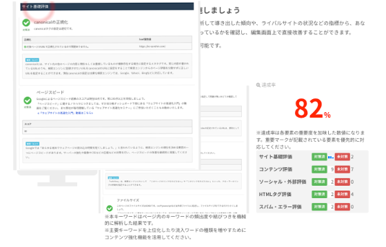 あなたが運営するウェブサイトやブログが狙ったキーワードで検索エンジンから好まれる構造になっているのかがわかる「SEO内部対策レポート」をお渡しします。「サイト基礎評価」「コンテンツ評価」「SNS評価」「HTMLタグ評価」「スパム・エラー評価」など、36項目にわたり詳細に調査を致しますので、未達成の部分が可視化できるので、何をすれば良いのかがわかります。
